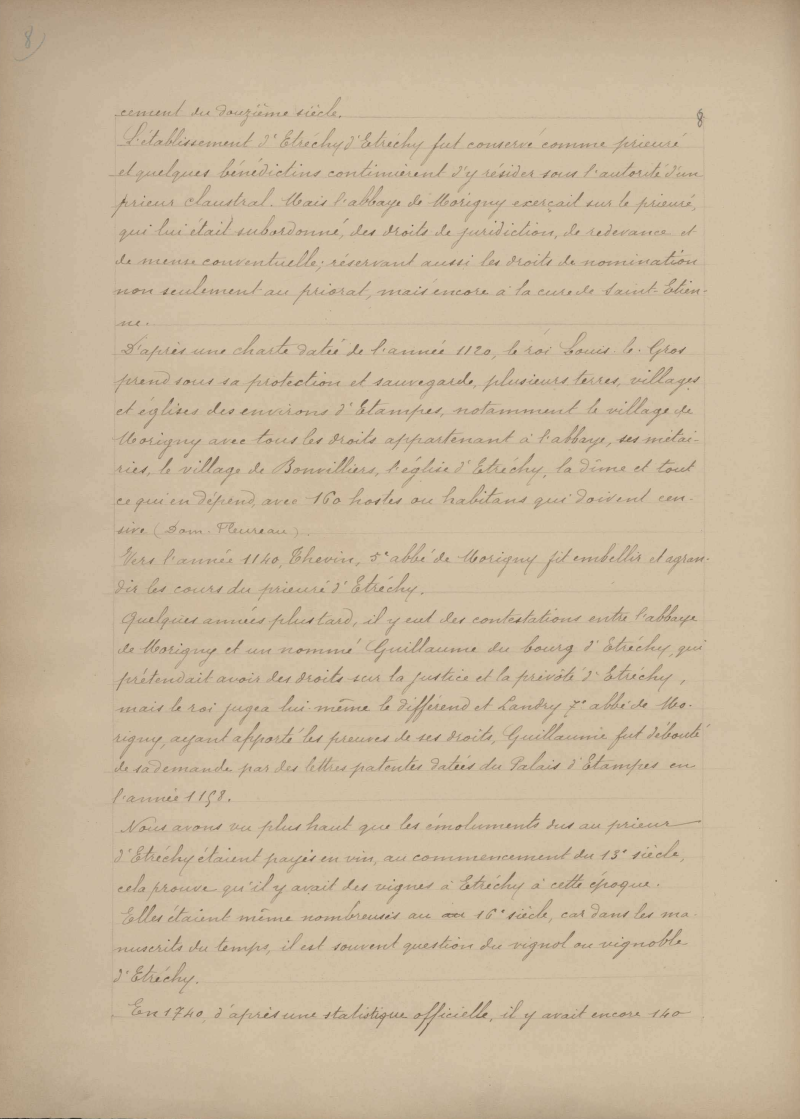 - D'après une charte datée de l'année 1120, le roi Louis le Gros prend sous sa protection et sauvegarde plusieurs terres, villages et églises des environs d'Étampes, notamment le village de Morigny avec tous les droits appartenant à l'abbaye, ses métairies, le village de Bonvilliers, l'église d'Étréchy, la dîme et tout ce qui en dépend, avec 160 hostes ou habitants qui doivent cenvive (dom Fleureau).
