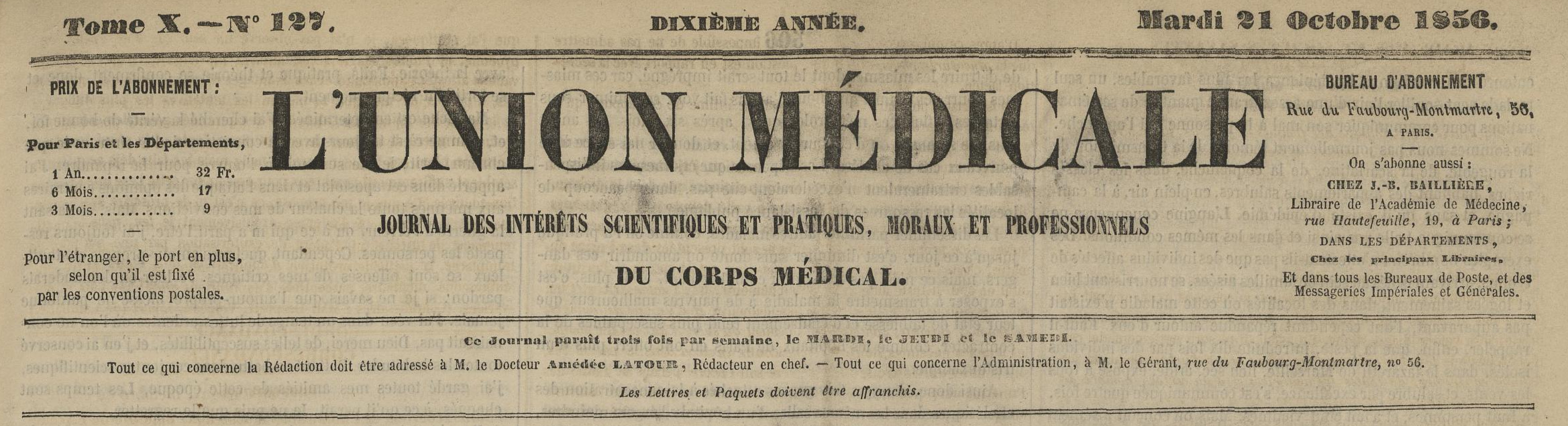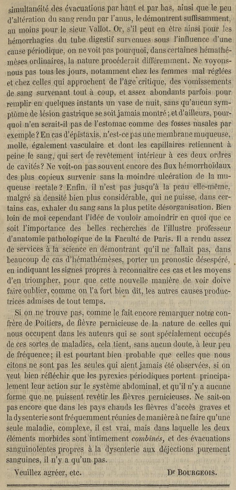 - Justin Bourgeois, “Observation de fièvre intermittente gastrorrhagique”, L'Union médicale 10/127 (1856) 506-507.
