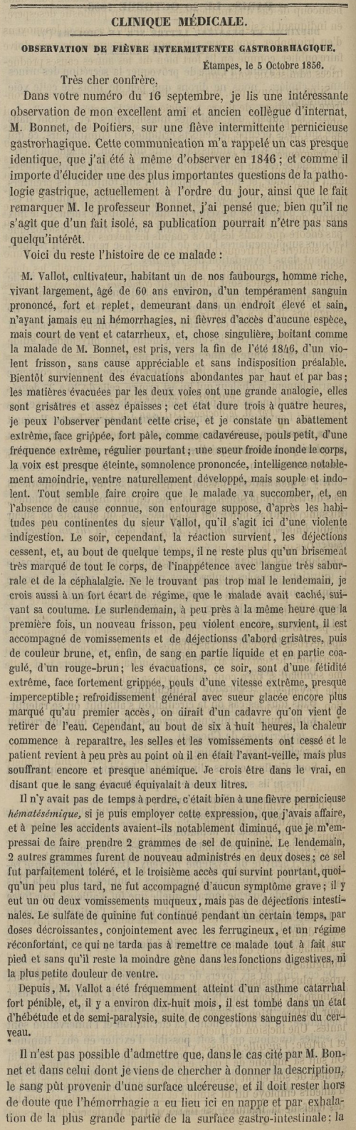 - Dans votre numéro du 16 septembre, je lis une intéressante observation de mon excellent ami et ancien collègue d'internat, M. Ronnet, de Poitiers, sur une fiève intermittente pernicieuse gastrorhagique. Cette communication m'a rappelé un cas presque identique, que j'ai été à même d'observer en 1846; et comme il importe d'élucider une des plus importantes questions de la pathologie gastrique, actuellement à l'ordre du jour, ainsi que le fait remarquer M. le professeur Bonnet, j'ai pensé que, bien qu'il ne s'agit que d'un fait isolé, sa publication pourrait n'être pas sans quelqu'intérêt.