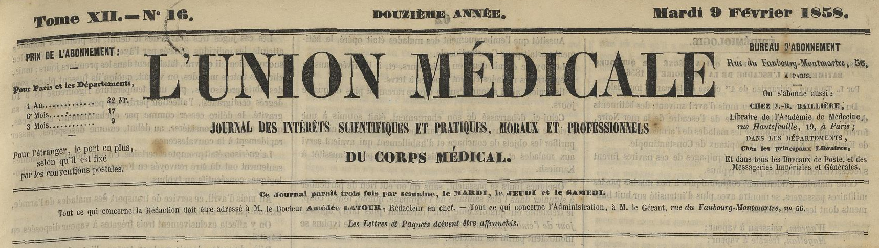 - Justin Bourgeois, "Observation de tétanos mortel survenu à la suite de la cautérisation d'une tumeur par un caustique", L'Union médicale 12/16 (1858) 63.