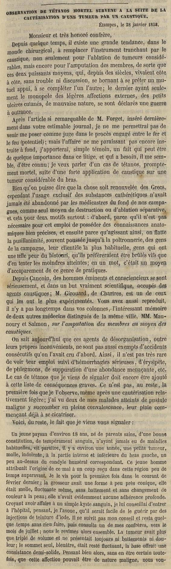 - Après l'article si remarquable de M. Forget, inséré dernièrement dans votre estimable journal, je ne me permettrai pas de venir me poser comme juge dans le procès engagé entre le fer et le feu (potentiel); mais l'affaire ne me paraissant pas encore instruite à fond, j'apporterai, simple témoin, un fait qui peut être de quelque importance dans ce litige, et qui a besoin, il me semble, d'être connu; je yeux parler d'un cas de tétanos, promptement mortel, suite d'une forte application de caustique sur une tumeur considérable du bras.