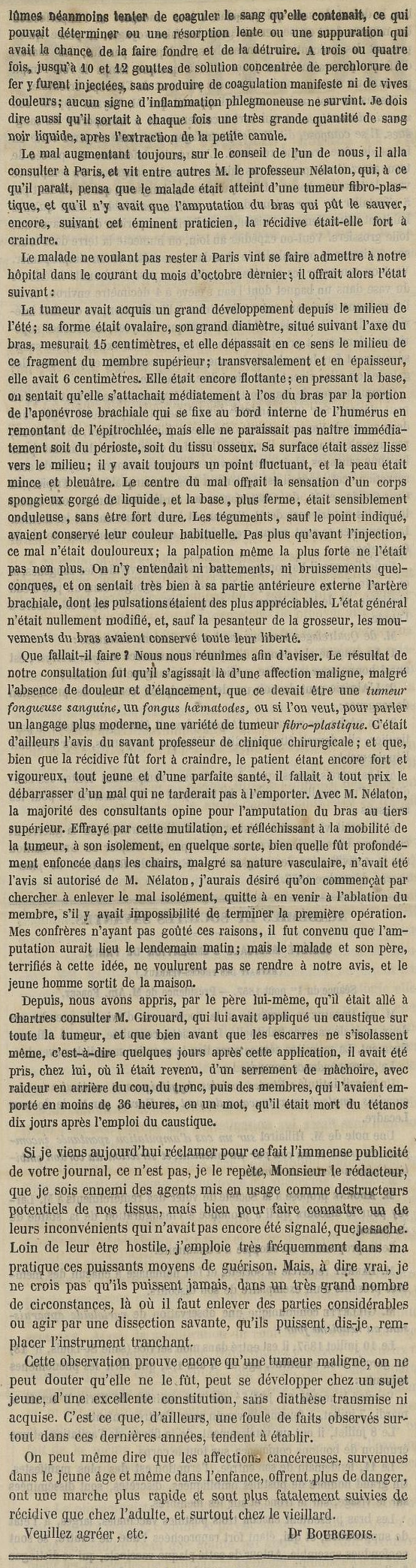 - Si je viens aujourd'hui réclamer pour ce fait l'immense publicité de votre journal, ce n'est pas, je le répète, Monsieur le rédacteur, que je sois ennemi des agents mis en usage comme destructeurs potentiels de nos tissus, mais bien pour faire connaître un de leurs inconvénients qui n'avait pas encore été signalé, que je sache. Loin de leur être hostile, j'emploie très fréquemment dans ma pratique ces puissants moyens de guérison. Mais, à dire vrai, je ne crois pas qu'ils puissent jamais, dans un très grand nombre de circonstances, là où il faut enlever des parties considérables ou agir par une dissection savante, qu'ils puissent, dis-je, remplacer l'instrument tranchant.