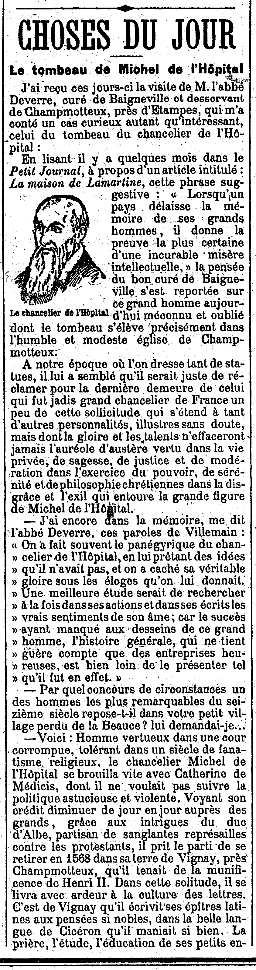 - J'ai reçu ces jours-ci la visite de M. l'abbé Deverre, curé de Baigneville1) et desservant de Champmotteux, près d'Étampes, qui m'a conté un cas curieux autant qu'intéressant, celui du tombeau du chancelier de l'Hôpital: :