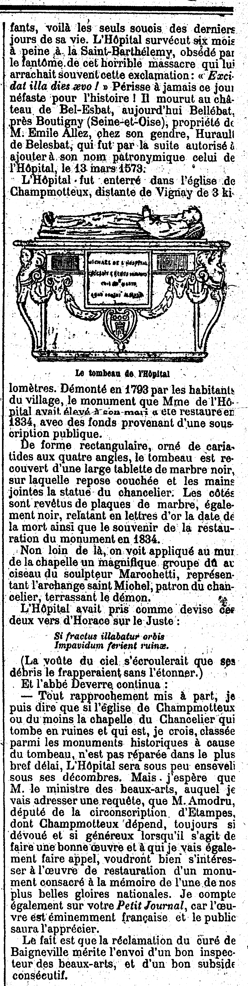- — Tout rapprochement mis à part, je puis dire que si l'église de Champmotteux ou du moins la chapelle du Chancelier qui tombe en ruines et qui est, je crois, classée parmi les monuments historiques à cause du tombeau, n'est pas réparée dans le plus bref délai, L'Hôpital sera sous peu enseveli sous ses décombres. Mais, j'espère que M. le ministre des beaux-arts, auquel je vais adresser une requête, que M. Amodru, député de la circonscription d'Étampes, dont Champmotteux dépend, toujours si dévoué et si généreux lorsqu'il s'agit de faire une bonne œuvre et à qui je vais également faire appel, voudront bien s'intéresser à l'œuvre de restauration d'un monument consacré à la mémoire de l'une de nos plus belles gloires nationales. Je compte également sur votre Petit Journal, car l'œuvre est éminemment française et le public saura l'apprécier.