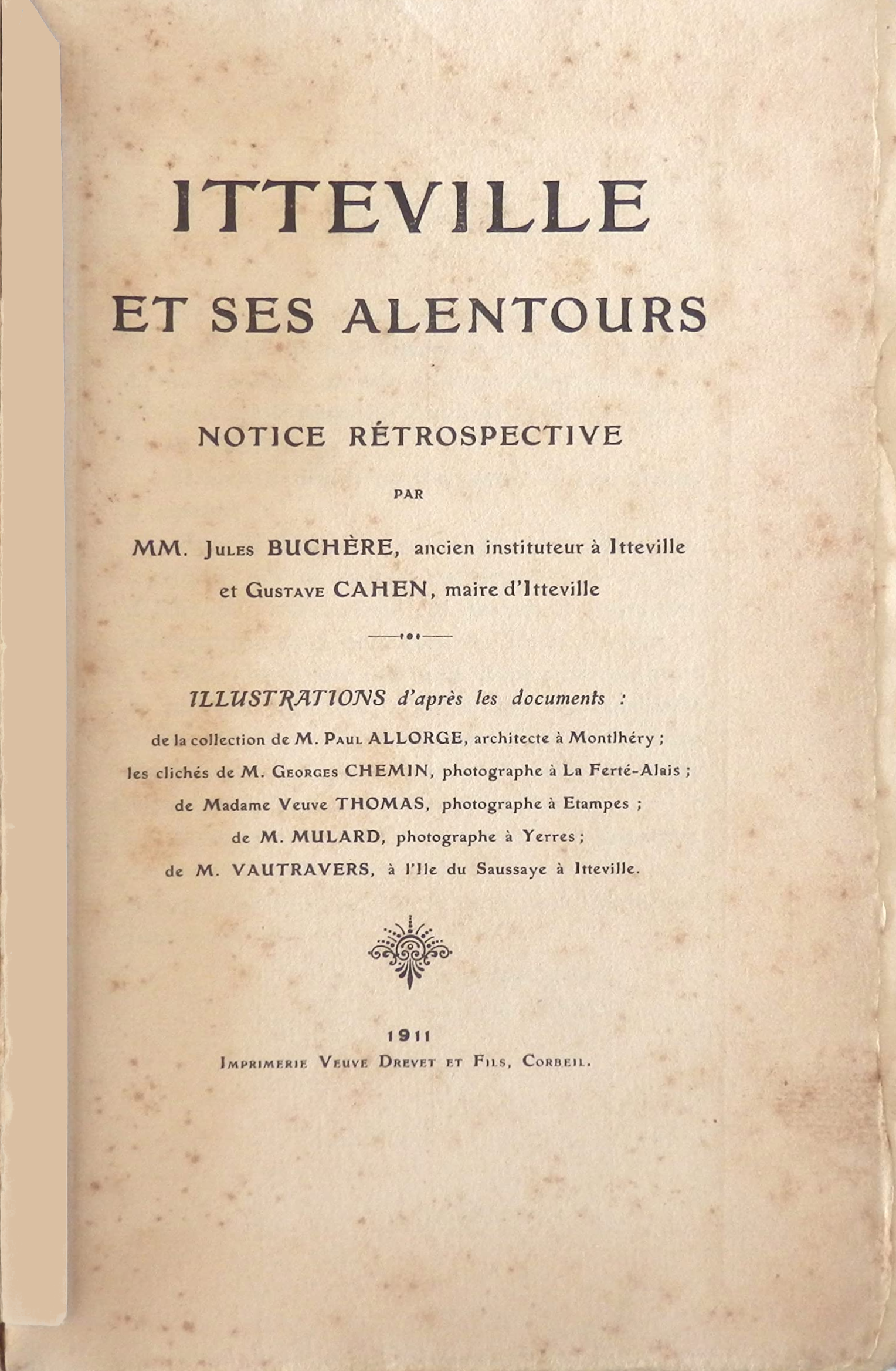 - Jules Bucherre (et non Buchère) et Gustave Cahen, Itteville et ses environs. Notice rétrospective (in-16, 103 p., illustrations, bibliographie pp. 102-103), Corbeil, Drevet, 1911.