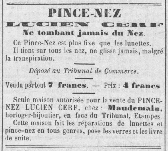 - “Pince-nez Lucien Cerf, ne tombant jamais du nez. — Ce pince-nez est plus fixe que les lunettes. Il tent sur tous les nez, ne glisse jamais, malgré la transpiration. — Déposé au Tribunal de Commerce. — Vendu partout 7 francs. — Prix: 4 francs. — Seule maison autorisée pour la vente du pince-nez Lucien Cerf, chez: Maudemain, horloger-bijoutier, en face du Tribunal, Étampes. — Cette maison fait les réparations de lunettes et pince-nez en tous genres, pose les verres et les livre de suite.”