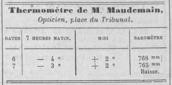 - “Thermomètre de M. Maudemain, opticien, place du Tribunal. — 6 (décembre), 7 heures (du) matin: -4 °; midi: +2°; baromètre: 768 mm — 7 (décembre), 7 heures (du) matin: -3°; midi: +2°; baromètre: 765 mm: Baisse.”