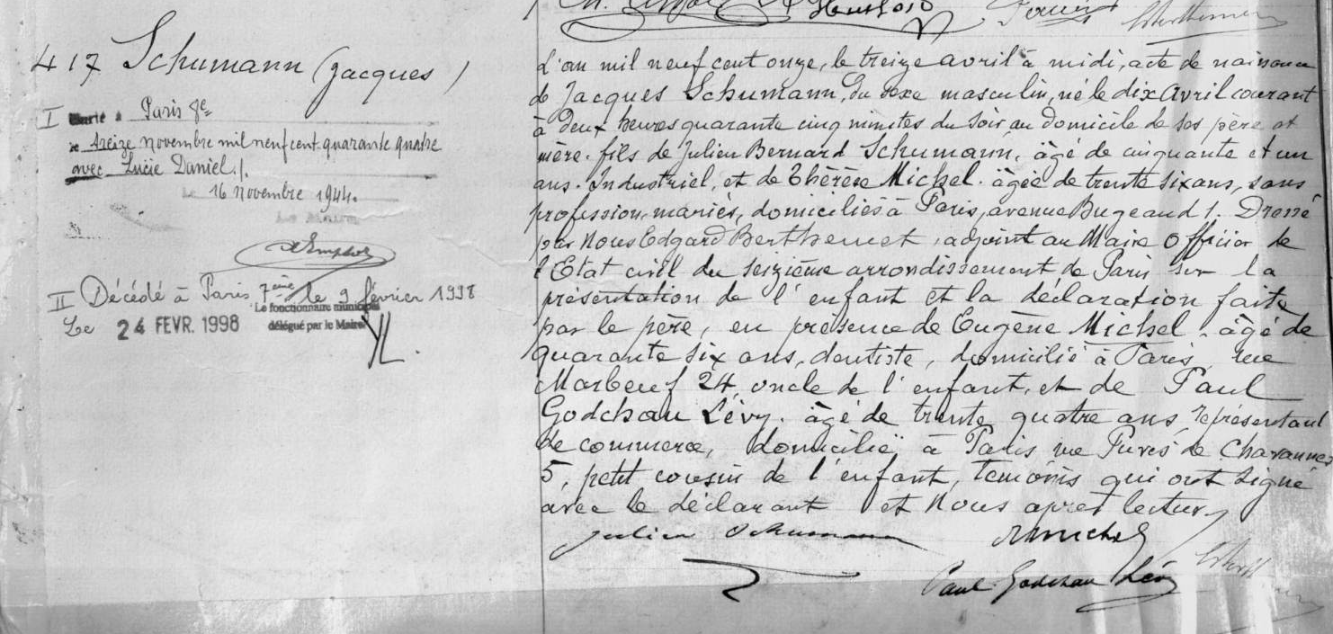 - Jacques Schumann (surnommé Maurice en hommage à son grand-père maternel mort le jour même de sa naissance), né le 10 avril 1911 à Paris 16e arrondissement, était le fils du négociant et industriel Julien-Bernard Schumann (1858-1940) et de Thérèse Michel (1875-1962).