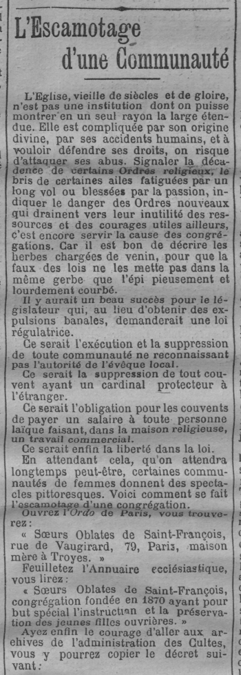 - “Sœurs Oblates de Saint-François, congrégation fondée en 1870 ayant pour but spécial l'instruction et la préservation des jeunes filles ouvrières.”