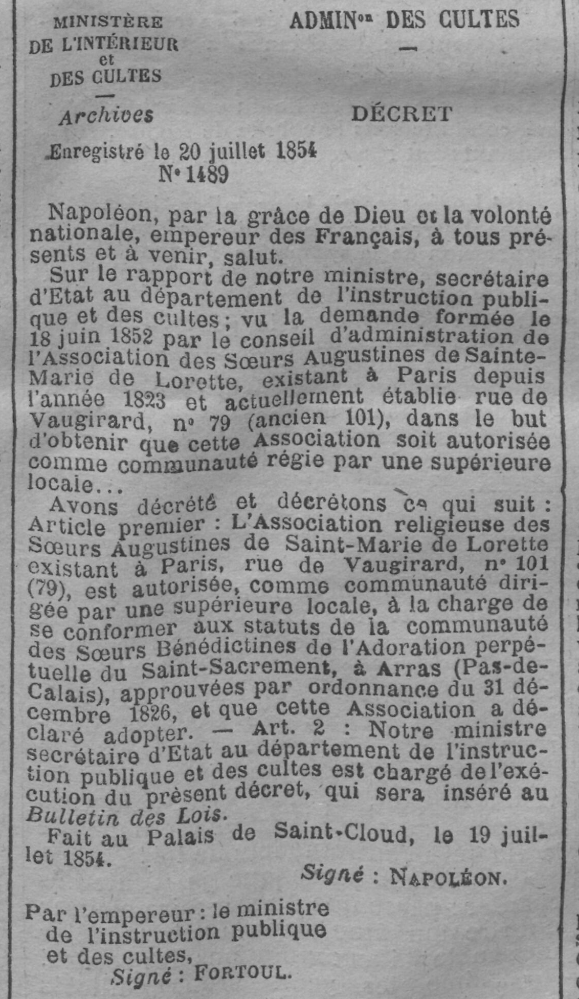 - Sur le rapport de notre ministre, secrétaire d'État au département de l'instruction publique et des cultes; vu la demande formée le 18 juin 1852 par le conseil d'administration de l'Association des Sœurs Augustines de Sainte-Marie de Lorette existant à Paris depuis l'année 1823 et actuellement établie rue de Vaugirard, n° 79 (ancien 101), dans le but d'obtenir que cette Association soit autorisée comme communauté régie par une supérieure locale…