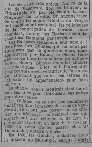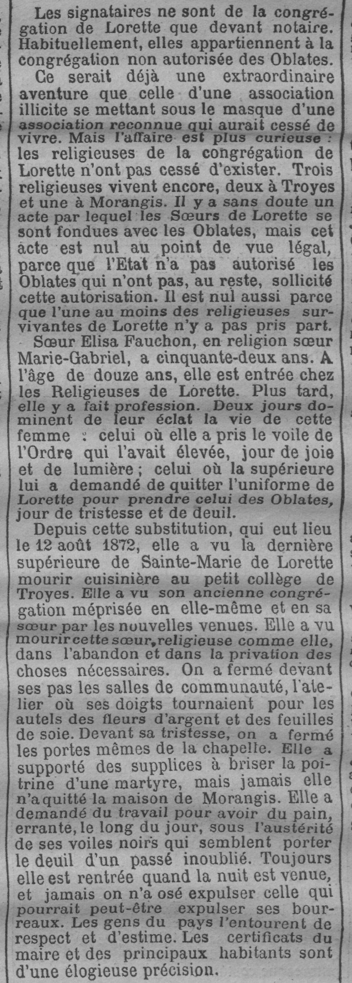 - Ce serait déjà une extraordinaire aventure que celle d'une association illicite se mettant sous le masque d'une association reconnue qui aurait cessé de vivre. Mais l'affaire est plus curieuse; les religieuses de la congrégation de Lorette n'ont pas cessé d'exister. Trois religieuses vivent encore, deux à Troyes et une à Morangis. Il y a sans doute un acte par lequel les Sœurs de Lorette se sont fondues avec les Oblates, mais cet acte est nul au point de vue légal, parce que l'État n'a pas autorisé les Oblates qui n'ont pas, au reste, sollicité cette autorisation. Il est nul aussi parce que l'une au moins des religieuses survivantes de Lorette n'y a pas pris part.