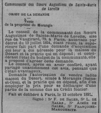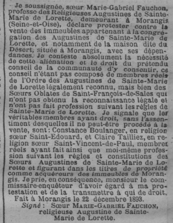 - Je soussignée, sœur Marie-Gabriel Fauchon, professe des Religieuses Augustines de Sainte-Marie de Lorette, demeurant à Morangis (Seine-et-Oise), déclare protester contre la vente des immeubles appartenant à la congrégation des Augustines de Sainte-Marie de Lorette, et notamment de la maison dite du Désert, située à Morangis, avec ses dépendances. Je conteste absolument la nécessité de cette aliénation et le droit du prétendu conseil de la communauté d'y consentir, ce conseil n'étant pas composé de membres réels de l'Ordre des Augustines de Sainte-Marie de Lorette légalement reconnu, mais bien des Sœurs Oblates de Saint-François-de-Sales qui n'ont pas obtenu la reconnaissance légale et n'ont pas fait profession suivant les règles de Sainte-Marie de Lorette. Je signale que les véritables membres ayant droit, sans l’assentiment desquelles il ne peut être procédé à la vente, sont: Constance Boulanger, en religion sœur Saint-Édouard, et Claire Tailliez, en religion sœur Saint-Vincent-de-Paul, membres réels ayant fait ainsi que moi-même profession suivant les règles et constitutions des Sœurs Augustines de Sainte-Marie de Lorette et figurant dans les titres de propriété comme acquéreurs des immeubles de Morangis. Je prie, en conséquence, monsieur le commissaire-enquêteur d'avoir égard à ma protestation et de la transmettre à qui de droit.