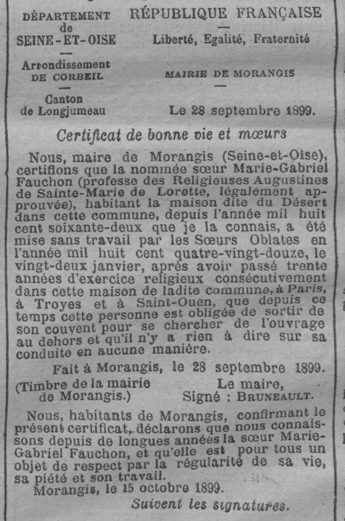 - Nous, maire de Morangis (Seine-et-Oise), certifions que la nommée sœur Marie-Gabriel Fauchon (professe des Religieuses Augustines de Sainte-Marie de Lorette, légalement approuvée), habitant la maison dite du Désert dans cette commune, depuis l'année mil huit cent soixante-deux que je la connais, a été mise sans travail par les Sœurs Oblates en l'année mil huit cent quatre-vingt-douze, le vingt-deux janvier, après avoir passé trente années d'exercice religieux consécutivement dans cette maison de ladite commune, à Paris, à Troyes et à Saint-Ouen, que depuis ce temps cette personne est obligée de sortir de son couvent pour se chercher de l'ouvrage au dehors et qu'il n'y a rien à dire sur sa conduite en aucune manière.