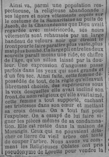 - Ainsi va, parmi une population respectueuse, la religieuse abandonnée: ses légers et noirs vêtements copiés sur le costume de la Samaritaine au puits de Jacob, de la Chananéenne que Dieu avait regardée avec miséricorde, ses noirs vêtements sont rehaussés par un large bandeau de velours noir qui étreint le front pour le faire paraître plus vaste, plus mat, plus bombé. Un large pli entre les deux sourcils paraît moins une ride, ce chiffre de l'âge, qu'un sillon laissé par la douleur. Une expression d'angoisse passe parfois dans les yeux qui sont grands et d'un feu sec. Ainsi faite, cette femme dépossédée de tout, de la règle qu'elle avait librement choisie, des supérieures sous la voix desquelles elle avait incliné son front, du nom religieux qu’elle avait aimé, cette femme a tout supporté, cachant ses tristesses dans son cœur et mettant sa croix dessus. On a tout fait pour l'expulser. On a essayé de lui faire signer les pièces mêmes de sa condamnation. Elle est restée dans la maison de Morangis. Ceux qui ne pouvaient détacher ce lierre du vieil arbre ont tenté de couper l'arbre. Nous avons vu comment les Religieuses Oblates ont pris pseudonyme de Lorette pour vendre la maison où sœur Marie Fauchon se dressait comme un remords, spectre enveloppé dans la douleur du passé.