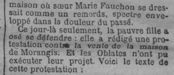 - Ce jour-là seulement, la pauvre fille a osé se défendre: elle a rédigé une protestation contre la vente de la maison de Morangis. Et les Oblates n'ont pu exécuter leur projet. Voici le texte de cette protestation: