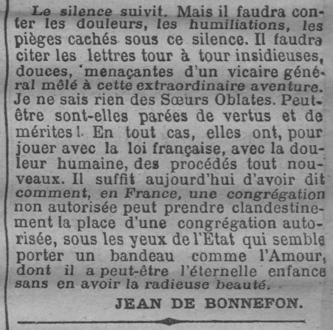 - Je ne sais rien des Sœurs Oblates. Peut-être sont-elles parées de vertus et de mérites! En tout cas, elles ont, pour jouer avec la loi française, avec la douleur humaine, des procédés tout nouveaux. Il suffit aujourd'hui d'avoir dit comment, en France, une congrégation non autorisée peut prendre clandestinement la place d'une congrégation autorisée, sous les yeux de l'État qui semble porter un bandeau comme l'Amour, dont il a peut-être l'éternelle enfance sans en avoir la radieuse beauté.