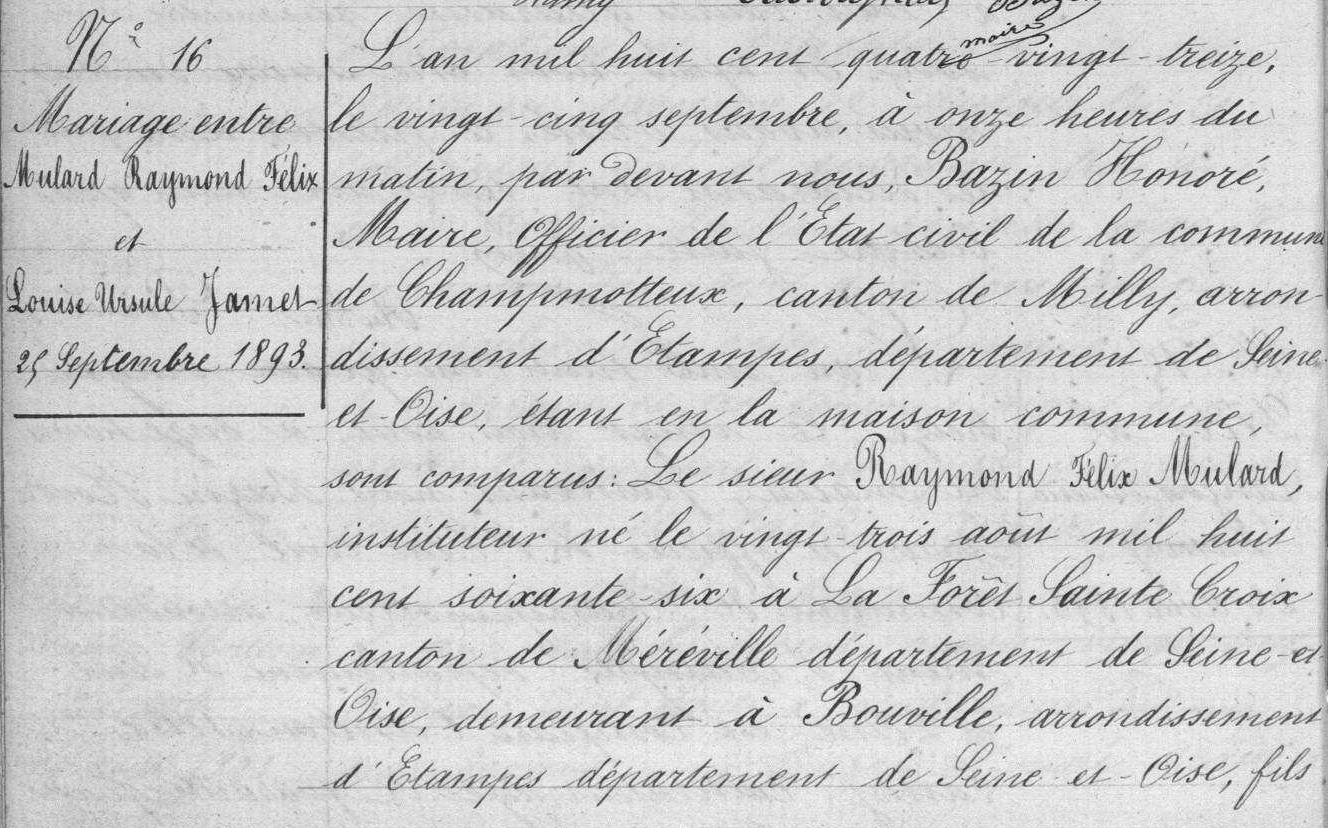 - Raymond-Félix Mulard, né le 23 août 1866 à la Forêt-Sainte-Croix, était le fils d'Éléonore Clémentine Zéphire Moullé (1841-1885) et de l'instituteur Félix-Auguste-Mulard (1843-1908).