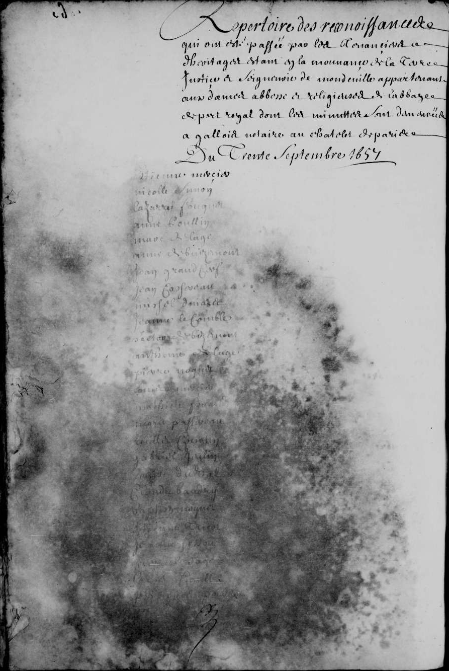 - Repertoire des reconoissances qui ont esté passée par les tenanciers d'heritages estant en la mouvançe de la terre, justice et seigneurie de Mondeville appartenant aux dames abbesse et religieuses de l'abbaye de Port Royal dont les minuttes sont demeurées à Gallois notaire au Chatelet de Paris.