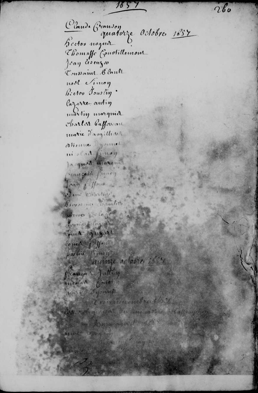 - Etienne Merçier — Nicolle Simon — Lazarre Fouquet — Anne Boullin — Marc Delage — Anne de Buizemont — Jean Grandcerf — Michel Dinars — Jeanne Lecomble — Hector de Bizemont — Anthoine Delage — Pierre Noguet — Louis Merçier — Mathieu Feret — Marie Passereau — Roullet Courtin — Gabriel Jeulin — Louise Duval — Claude Baudry — Baptiste Noguet — Estienne Tricot — Jeanne Fessou — Jeanne Delage — Louis Cault — Jean illisible |2| — Claude Cranson.