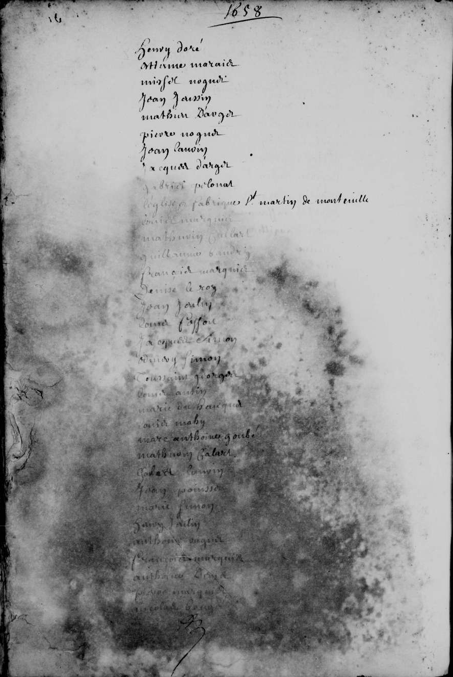 - Claude Passereau |3| — Henry Doré — Estienne Marais — Michel Noguet — Jean Jeuslin — Mathieu d'Arget (Lisez: Dagret) — Pierre Noguet — Jean Laurin — Jacques d'Arget (Lisez: Dagret) — Gabriel Pelonat — L'église et fabrique Saint Martin de Monteville — Louis Marquis — Mathurin Callart — Guillaume Baudry — Guillaume Baudry — François Marquis — Denise Leroy — Jean Jeulin — Louis Fessou — Jacques Simon — Edmery Simon — Toussaint Georges — Louis Autin — Marie du Hauquet — Louis Mahy — Marc Anthoine Goubé — Mathurin Calard — Gabriel Laurin — Jean Poinsset — Marie Simon — Henry Jeulin — Anthoine Raguet (?) — François Marquis — Anthoine Denis — Pierre Marquis — Nicolas Georges |4| — Gabriel Brisset.