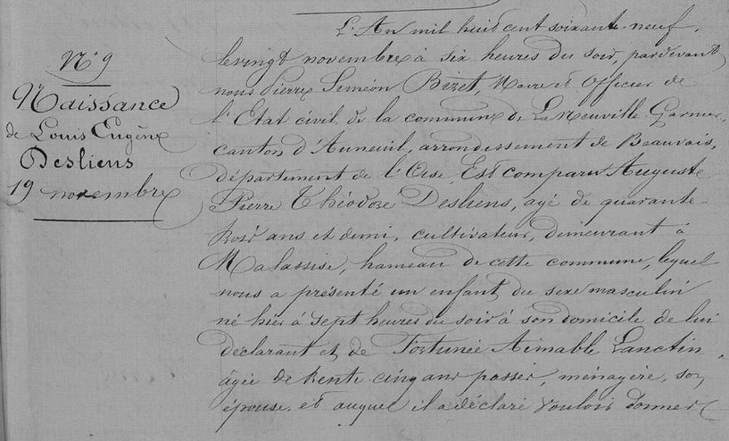 - Louis-Nicolas Desliens, né le 10 septembre 1855 à Malasisse, commune de La Neuville-Garnier (Oise), était le deuxième fils du meunier Auguste-Pierre-Théodore Desliens et de son épouse Fortunée Aimable Lanctin. L'un des témoins de sa naissance est un parent, Édouard-Henry Desliens, instituteur né le 30 mars 1829 à Berneuil-en-Bray et alors instituteur à La Neuville-Garnier.