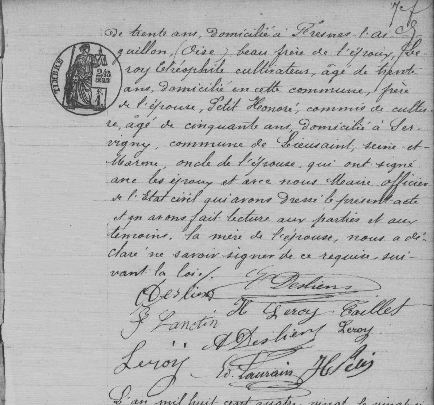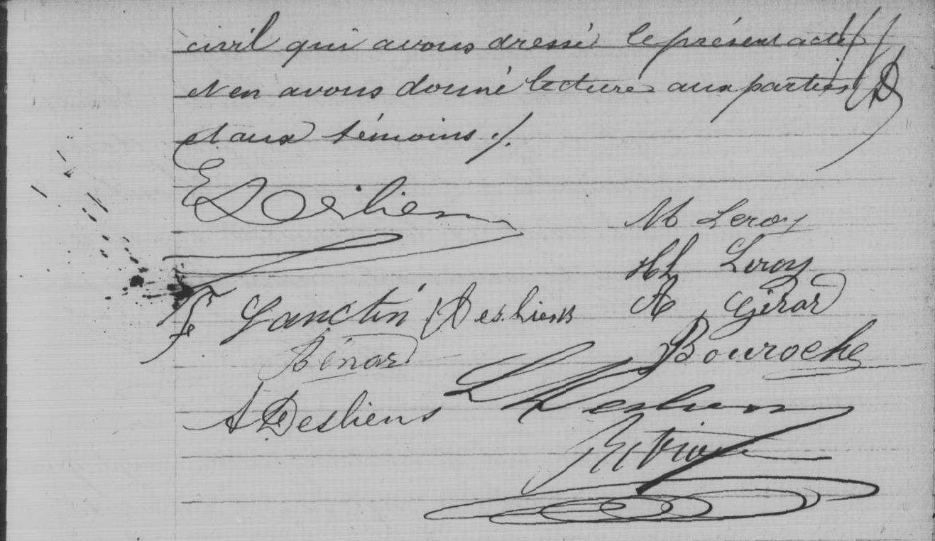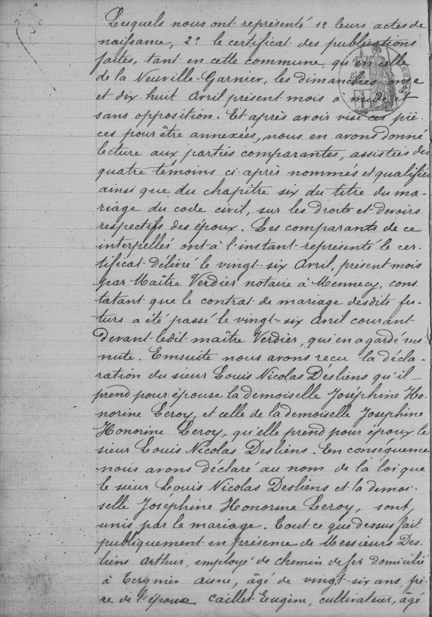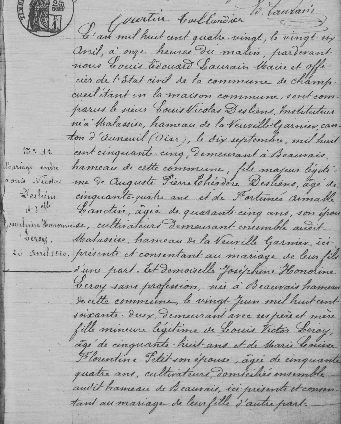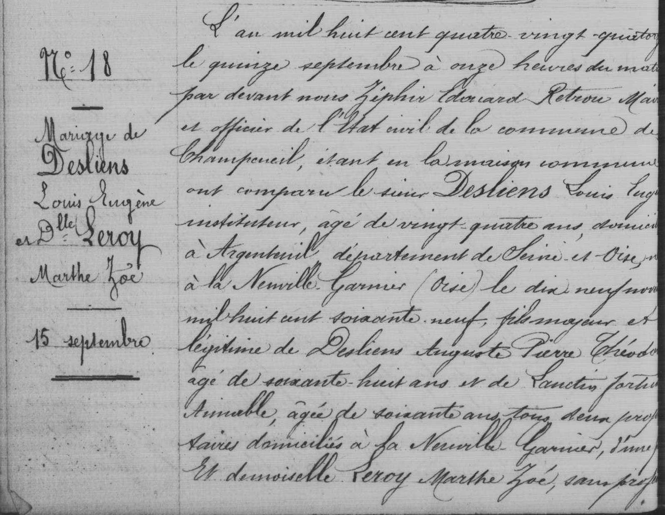 - Louis-Nicolas Desliens se marie le 26 avril 1880 à Champcueil avec Joséphine-Honorine Leroy, née en 1862, fille du cultivateur Louis-Victor Leroy et de son épouse Marie-Louise-Florentine Petit.