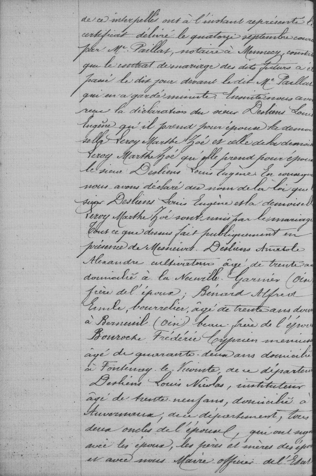 - Il assiste le 15 septembre 1894 à Champcueil au mariage de son neveu Louis-Eugène Desliens avec Marthe-Zoé Leroy (née en 1875), fille du cultivateur Henri Théophile Victor Leroy, beau-frère de Louis-Nicolas) et de la cultivatrice Anna Aline Girard demeurant à Beauvais, commune de Champcueil, avec pour témoin son frère Anatole-Alexandre Desliens, cultivateur, son beau-frère Alfred-Émile Bénard, bourrelier, Frédéric-Cyprien Bouroche oncle de l'épouse et menuisier, ainsi que son frère aîné Louis-Nicolas Desliens oncle par alliance de la mariée et alors instituteur à Auvernaux, le contrat de mariage ayant été passé le 14 septembre devant maître Paillat notaire à Mennecy.