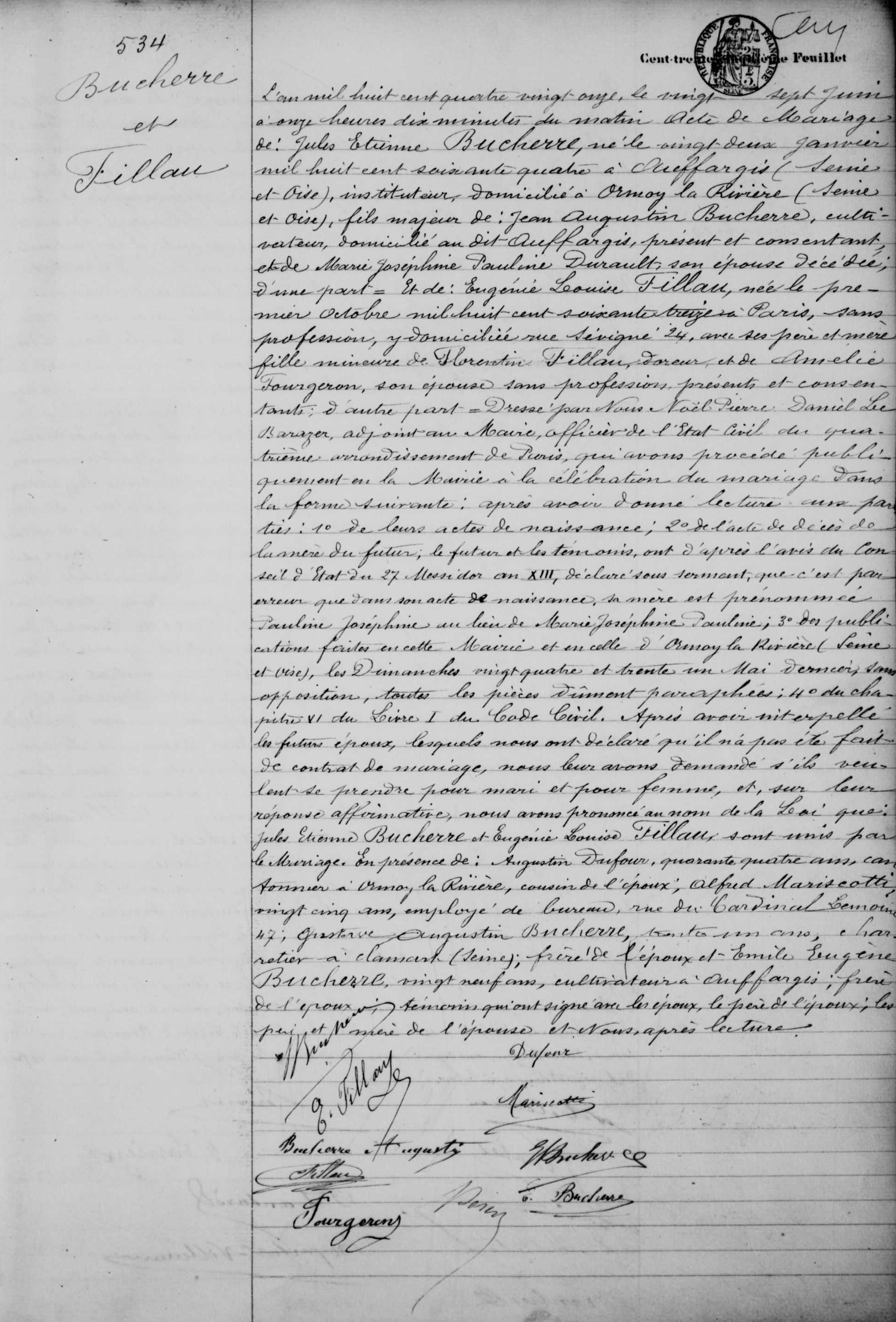 - Le cinq juillet mil neuf cent dix neuf, neuf heures du matin, Jules Étienne Bucherre né à Auffargis (Seine et Oise) le vingt deux janvier mil huit cent soixante quatre, instituteur public, époux de Eugénie Louise Fillau, fils de Jean Augustin Bucherre et de Marie Joséphine Pauline Dureault demeurant en cette commune est décédé en son domicile à Plaisir. Dressé le cinq juillet mil neuf cent dix neuf , six heures du soir, sur la déclaration de Gaston Carème, quarante ans, domicilié à Thiverval (Seine et Oise), Alexandre Désiré Boucher cinquante un ans, domicilié à Jouars Ponchartrain (Seine et Oise), tous deux instituteurs publics lesquels lecture faite ont signé avec nous Laurent Desplaces, maire de Plaisir. — [Signé:] A. Boucher — G. Carème — Desplaces.