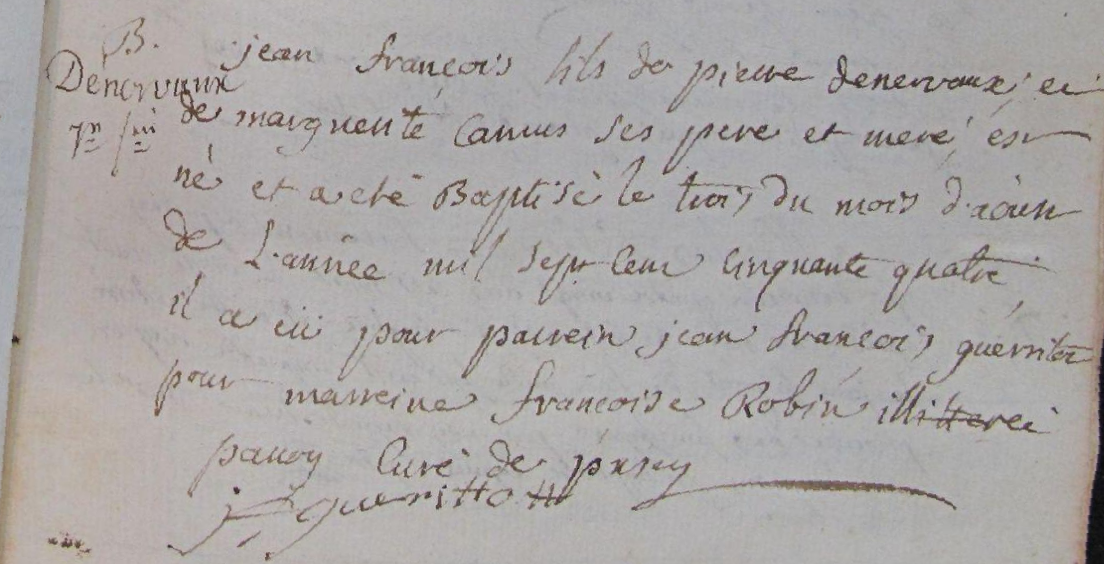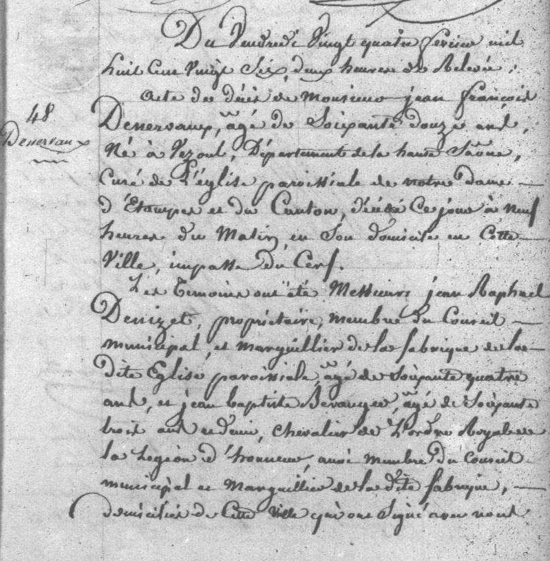 - Né à Pusey près Vesooul (Haute-Saône) le 3 août 1754, cinquième des six fils et dadet des enfants survivants du laboureur Pierre-Maurice Denervaux et de son épouse Marguerite Camus, mariés à Pusey le 9 janvier 1748, est ordonné prêtre du diocèse de Besançon, mais paraît avoir commencé sa carrière dans le diocèse de Vannes. Signalé en 1795 comme desservant son village natal de Pusey. Desservant des communes d'Étréchy et Chauffour relevant alors de la cure cantonale d'Étampes de 1803 à 1808. Bien noté par l'administration prefectorale en 1805. Desservant ||ferte.alais|La Ferté-Alais]] de l'été 1808 à l'été 1809. Curé de Notre-Dame d'Étampes depuis l'été 1809 jusqu'à sa mort survenue le 25 février 1826 à l'age de 72 ans.