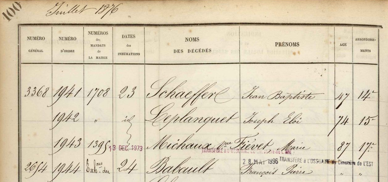 - Réinhumation à Paris (1876) puis transfert à l'ossuaire (1996)