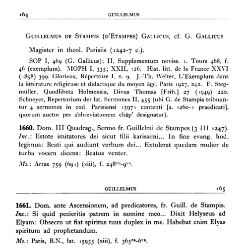 - “ubi G. de Stampis tribuuntur 4 sermones in codice Parisiensi 15971 contenti 1260-1261 praedicati, quorum auctor per abbreviationem chāp' designatur”.