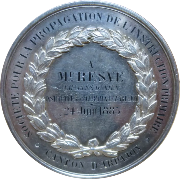 - Revers: SOCIETE POUR LA PROPAGATION DE L'INSTRUCTION PRIMAIRE — CANTON D'ARPAJON — [Personnalisation:] A Mr RESVE CHARLES DAMIEN INSTITUTEUR à St GERMAIN LES ARPAJON 24 JUIN 1883