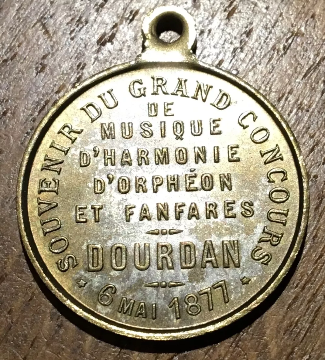 - Revers: SOUVENIR DU GRAND CONCOURS DE MUSIQUE, D'HARMONIE, D'ORPHÉON ET FANFARES — DOURDAN — 6 MAI 1877