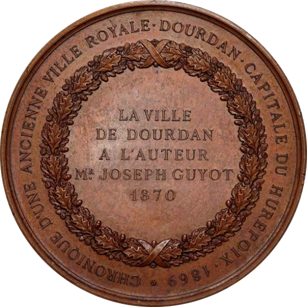 - Revers: CHRONIQUES D'UNE ANCIENNE VILLE ROYALE . DOURDAN . CAPITALE DU HUREPOIX . 1869 — LA VILLE DE DOURDAN A L'AUTEUR MR JOSEPH GUYOT 1870