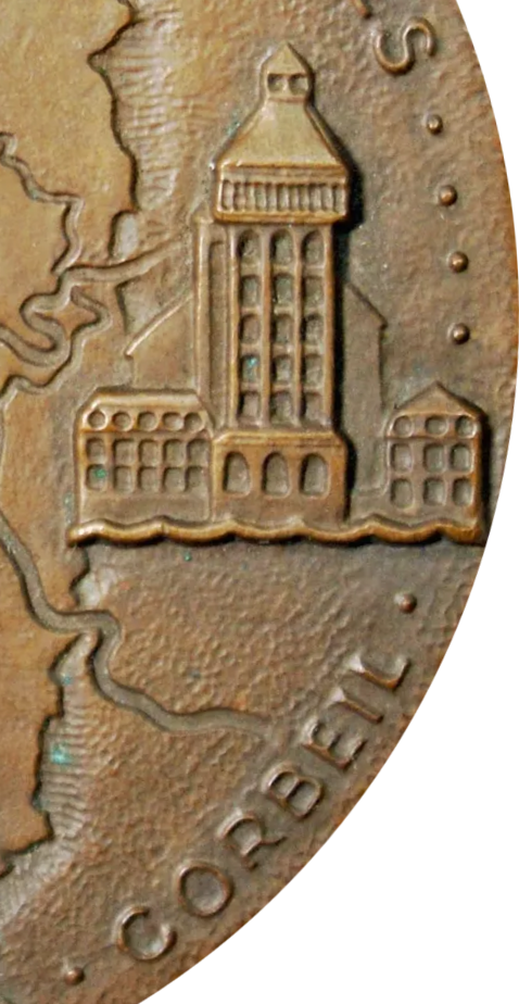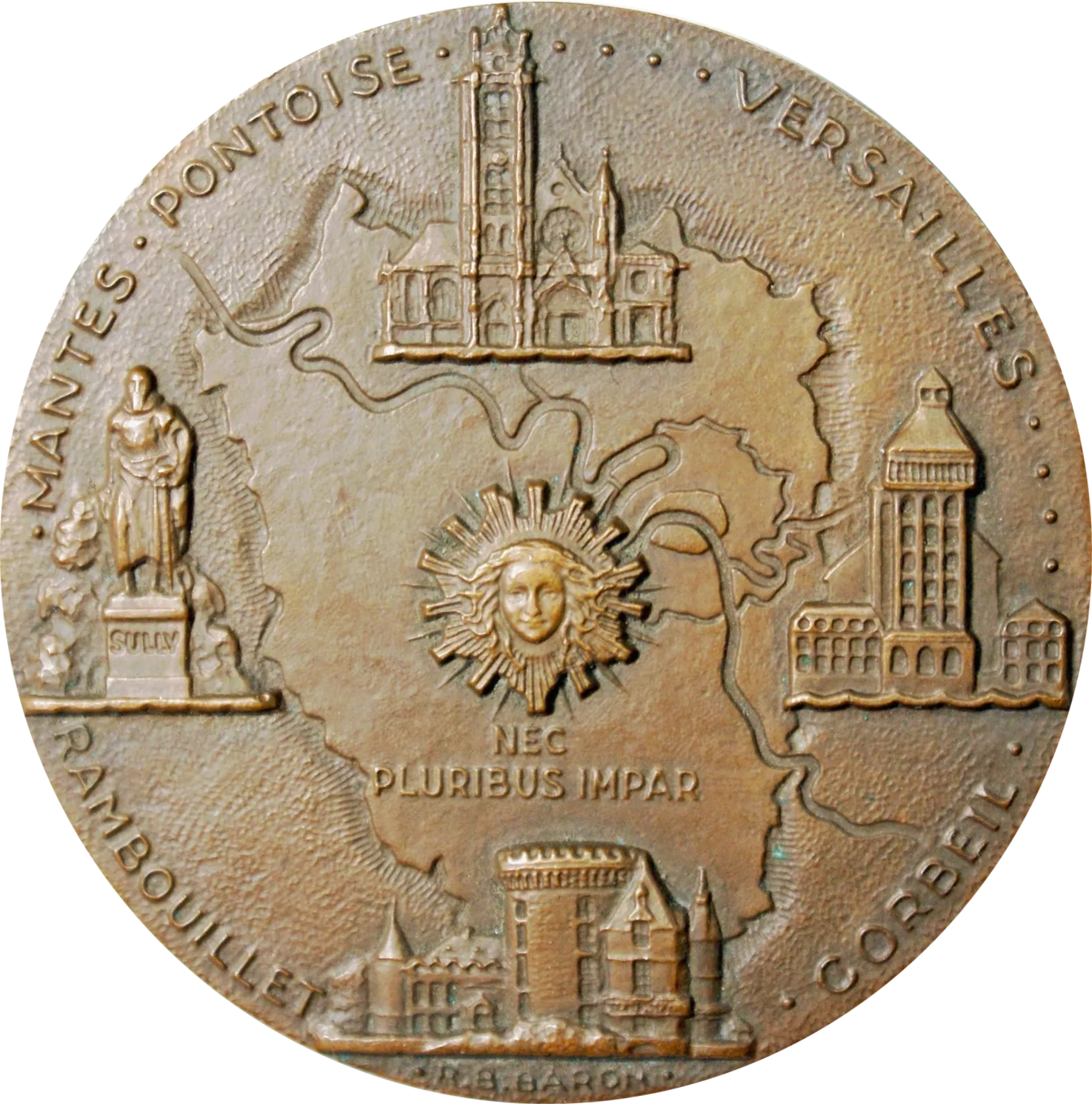 - Avers: MANTES — PONTOISE — VERSAILLES — RAMBOUILLET — CORBEIL — NEC PLURIBUS IMPAR — R.B. BARON