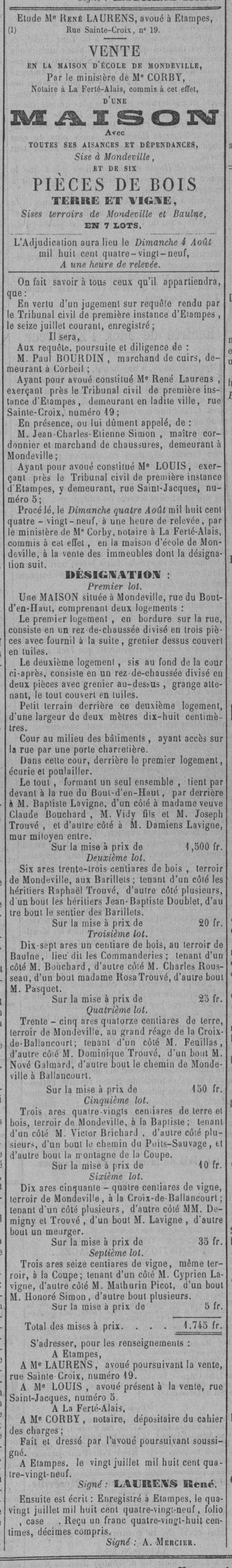 - René Laurens (avoué), “Vente d'une maison à Mondeville”, in Abeille d'Étampes 79/28 (28 juillet 1889) 4.