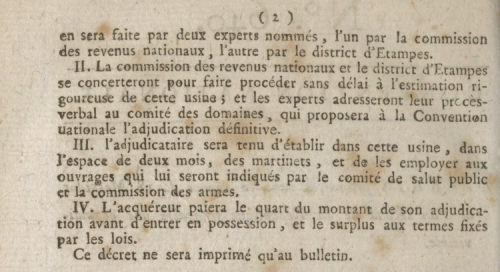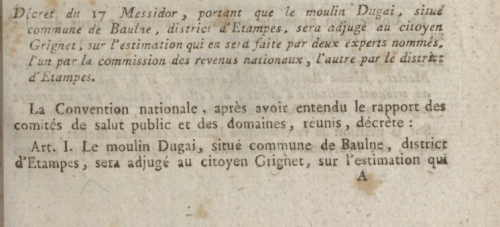 - Convention nationale, “Décret du 17 messidor, portant que le moulin Dugai, situé commune de Baulne, district d'Étampes, sera adjugé au citoyen Grignet, sur l'estimation qui en sera faite par deux experts nommés, l'un par la commission des revenus nationaux, l'autre par le district d'Étampes”, in Décrets prononcés dans la séance du 18 messidor de l'an second de la République française une et indivisible (12 p.), Paris, Imprimerie nationale, 1794 (n°640), pp 1-2.