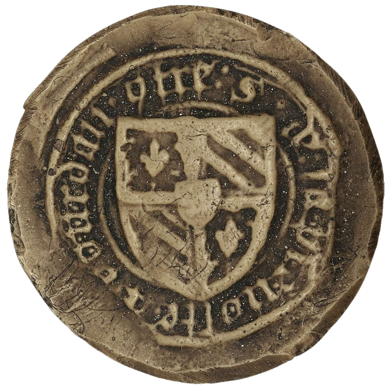 Écu écartelé aux : aux 1 et 4, de Bourgogne moderne (semé de fleurs de lys, à la bordure componnée); aux 2 et 3, de Bourgogne ancien (bandé, à la bordure); sur le tout, écusson usé. Les pointes de l'écu reposent sur le filet intérieur de la légende.