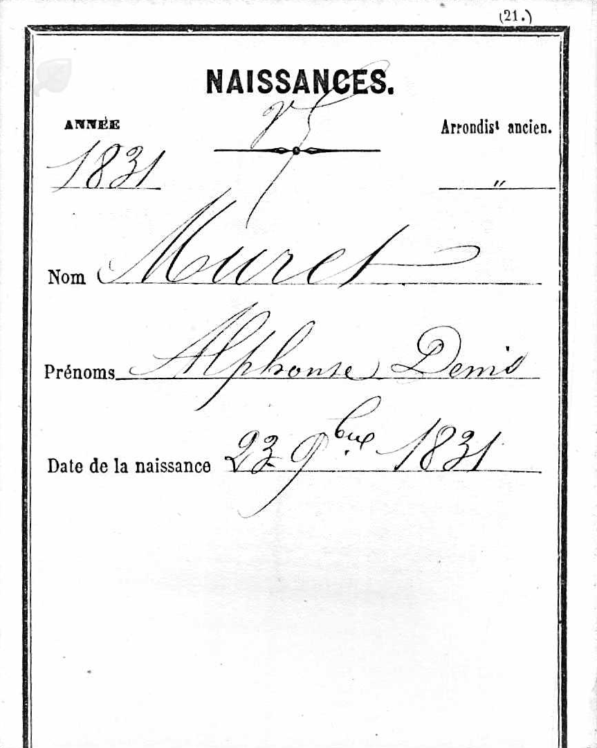 - Alphonse-Denis Muret, né à Paris le 23 novembre 1831, était le fils de Joséphine-Élisabeth-Céline Viret et de Jean-Baptiste-Denis Muret.