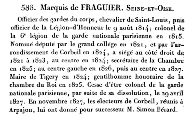 - Antoine-Geneviève-Amédée de Fraguier, né le 23 juillet 1775, était le fils du marquis Ambroise-Nicolas de Fraguier (1726-1795), ancien mousquetaire du roi, et de Marie-Françoise-Félicité de Mandat (1742-1798).