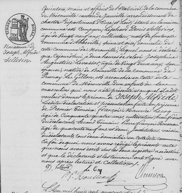 - Alfred-Joseph Sellerin, né Mérouville (Eure-et-Loir) le 19 mars 1846, était le fils du cultivateur Liphard-Denis Sellerin et de Joséphine-Augustine Levassort.