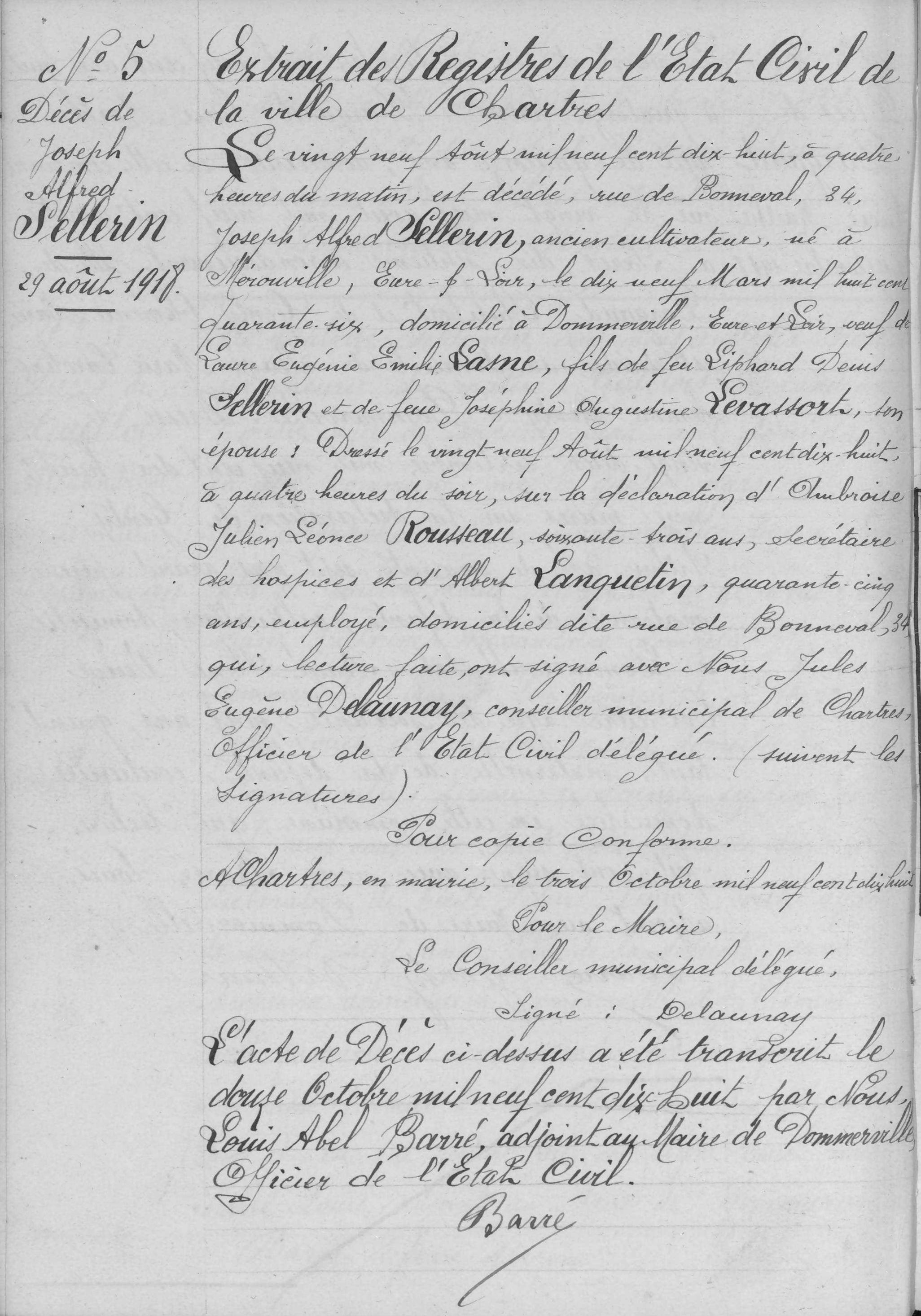 - Un dernier acte transcrit par Sellerin dans le registre d'état civil le 23 mai 1918. Une rectification y est ensuite portée par son adjoint Amilcar-Paul Leblanc le 30 juillet, il meurt le 29 août à l'hospice de Chartres.