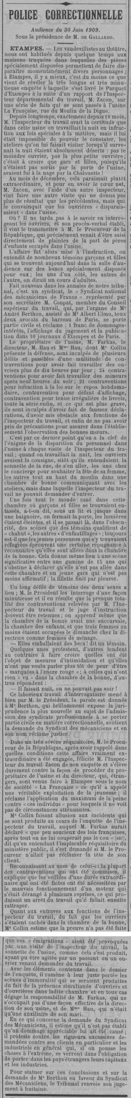 - Le propriétaire de l'usine, M. Farkas, le directeur, M. Hau et Mme Hau, dont Me Collin présente la défense, sont inculpés de plusieurs délits et passibles d'une multitude de contraventions pour avoir fait travailler des ouvriers plus de dix heures par jour; 24 contraventions pour avoir fait travailler des mineurs après neuf heures du soir; 21 contraventions pour infraction à la loi sur le repos hebdomadaire, contravention pour défaut d’affichage, contravention pour tenue irrégulière de livrets, toute la série enfin, et ce qui est plus grave, ils sont inculpés d'avoir fait de fausses déclarations, d'avoir mis obstacle aux fonctions de l'inspecteur du travail, et enfin de ne pas avoir pris de précautions pour assurer dans l'établissement l’observation des bonnes mœurs.