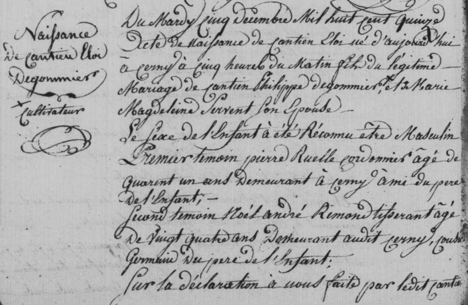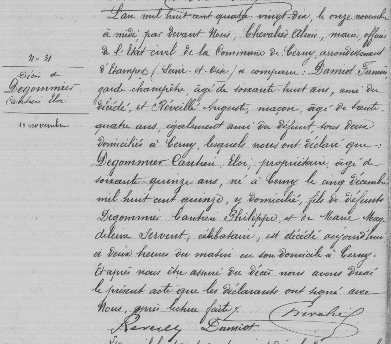 - Cantien-Éloi Degommier, né le 5 décembre 1815 à Cerny, était le fils de Marie-Madeleine Servant (1782-1871) et du cultivateur Cantien-Philippe Degommier (1777-1837), tous deux mariés le 25 avril 1809 à Puiselet-le-Marais.
