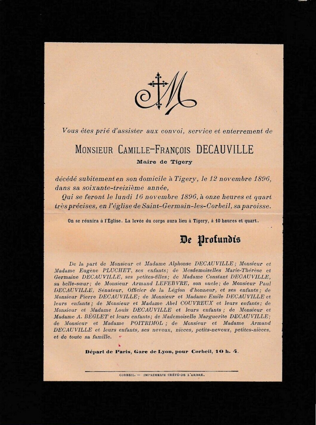 - Qui se feront le lundi 16 novembre 1896, à onze heures et quart très précises, en l’église de Saint-Germain-les-Corbeil, sa paroisse.