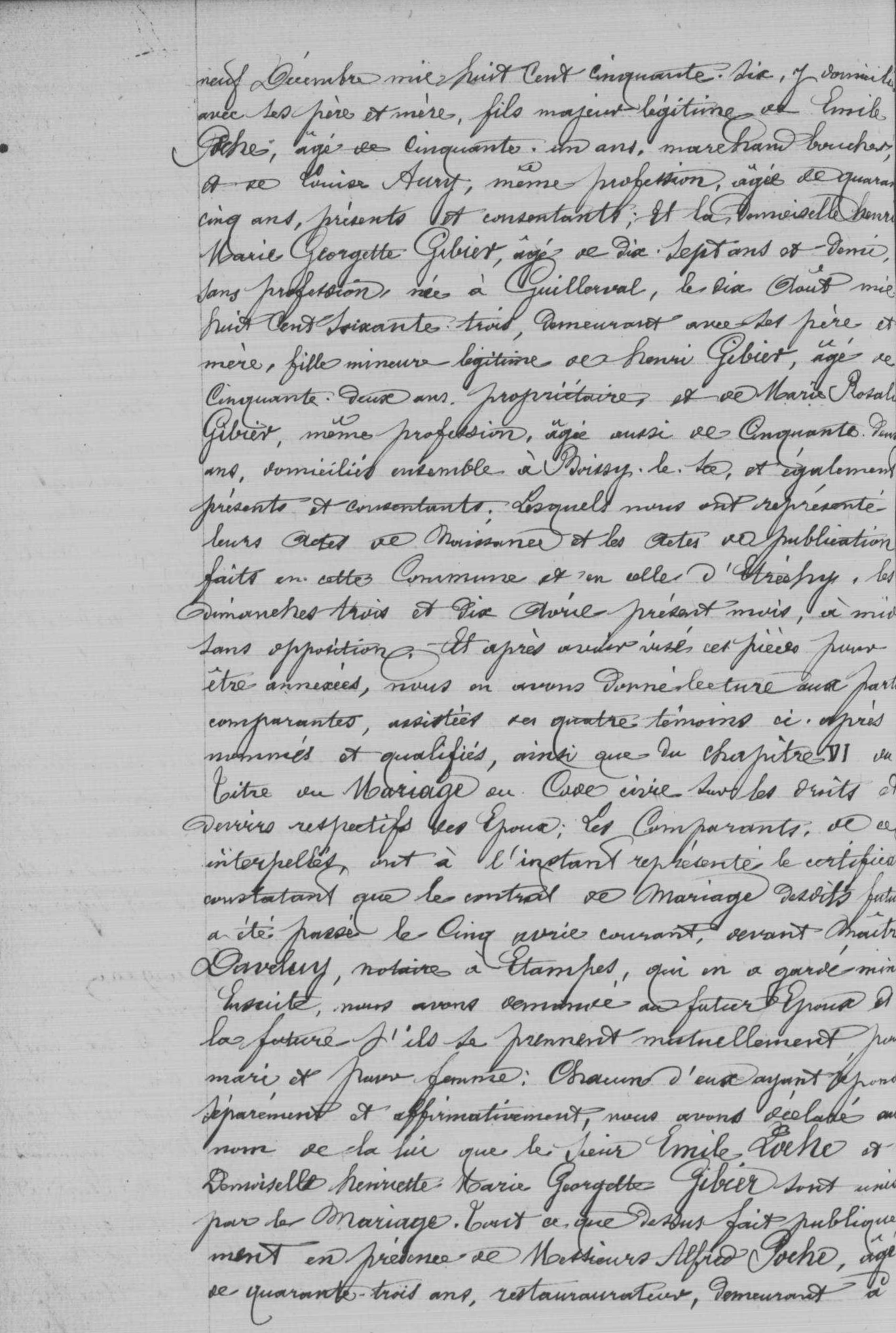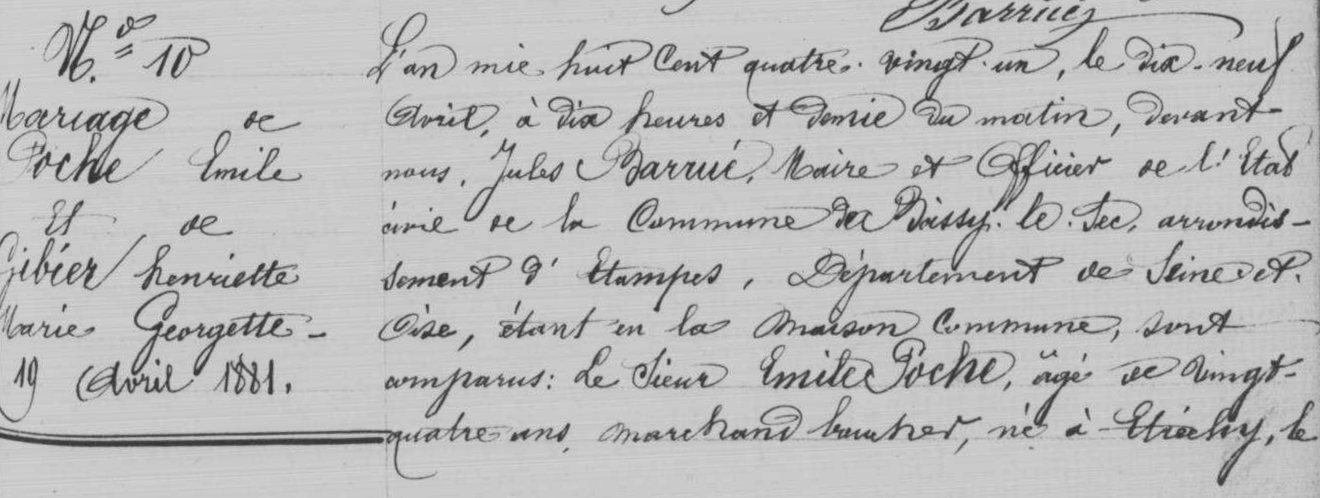 - Émile Poche premier du nom, né à Étampes le 22 février 1830, était le fils de Jean-François-Simon Poche (1801-1871), boucher à Étampes, et de Rosalie-Aglaé Boulland (1804-1857), tous deux mariés à Étampes le 25 février 1824.