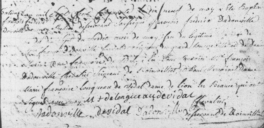 - François-Frédéric d'Adonville, né à Roinvilliers le le 17 mai 1750, était le fils de Marie-Anne-Françoise de Vidal (1721-1792) et de François II d'Adonville (1723-1792).