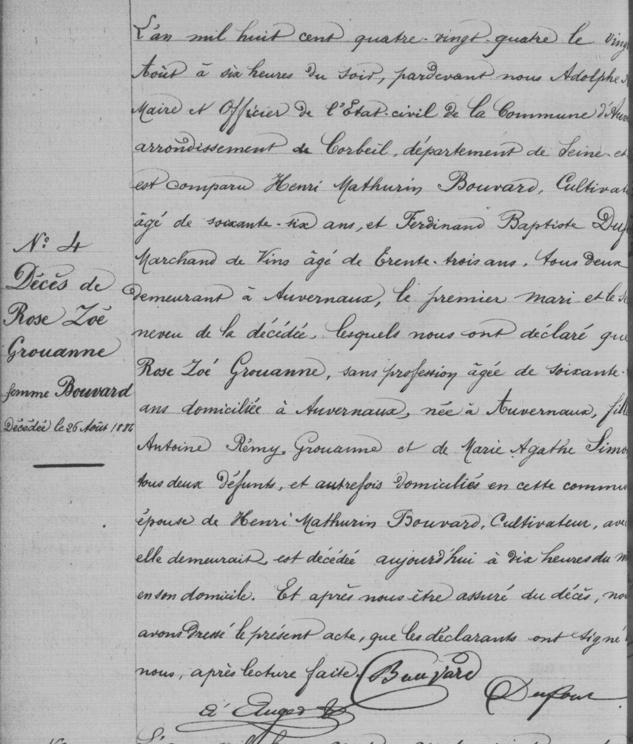 - Décès de sa femme à Auvernaux en 1884 — AD91 4E/3136.