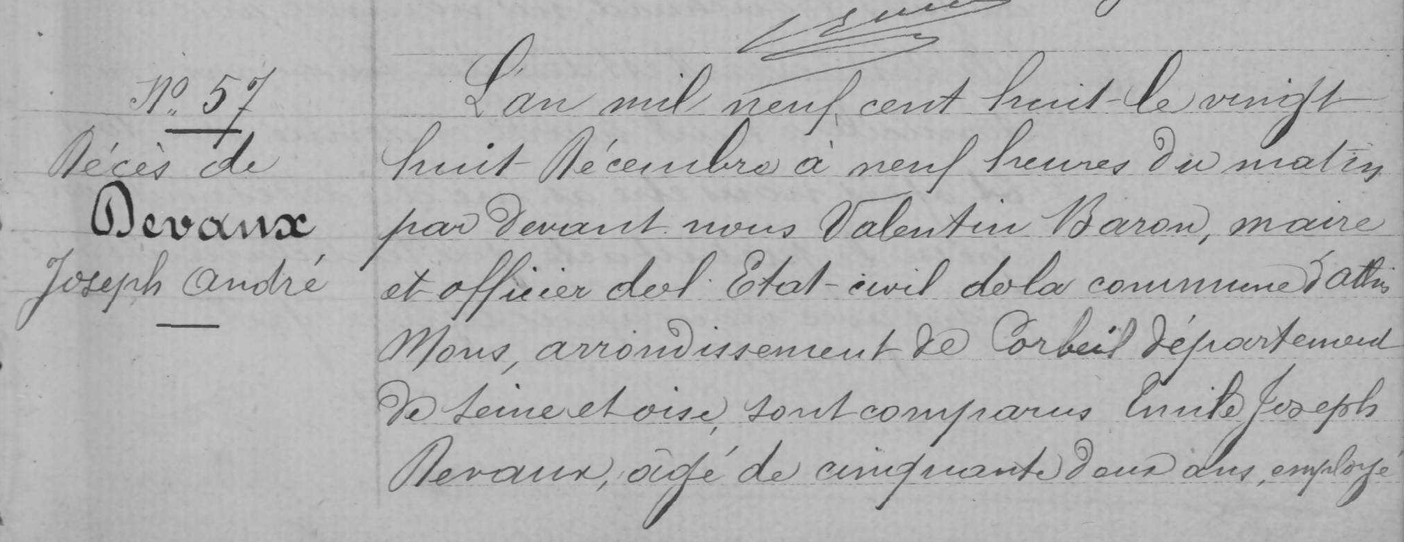 - Joseph-André Devaux, né le 13 septembre 1843 à Maigné (Sarthe), était le fils de Marie Baunée et de l'instituteur Joseph-André Devaux.