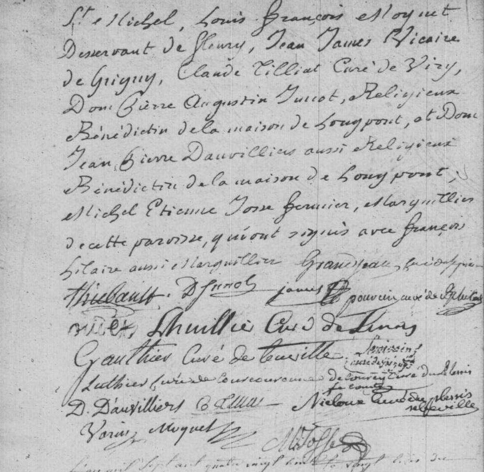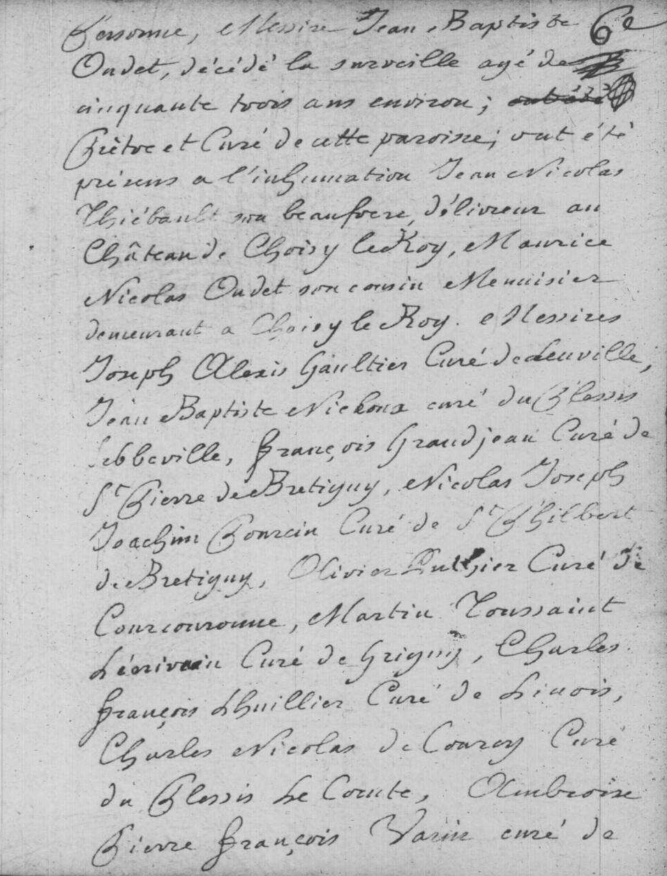 - L'an mil sept cent quatre vingt huit le quinze de novembre a été inhumé dans le cimetiere de cette paroisse vénérable, discrette et scientifique personne messire Jean Baptiste Oudet, décédé de la surveille, agé de cinquante trois ans ou environ, prêtre et curé de cette paroisse; ont été présens à l'inhumation Jean Nicolas Thiébault son beaufrère, delivreur au château de Choisy le Roy [Val-de-Marne], messires Joseph Alexis Gaultier curé de Leuville, Jean Baptiste Nieloux curé du Plessis Sebeville, François Grandjean curé de St Pierre de Bretigny, Nicolas Joseph Joachim Pourcin curé de St Philbert de Bretigny, Olivier Luthier curé de Courcouronne, Martin Toussaint Lécrivain curé de Grigny, Charles François Lhuillier curé de Linois, Charles Nicolas de Courcy curé du Plessis le Comte, Ambroise Pierre François Varin curé de St Michel, Louis François Moynet desservant de Fleury, Jean James vicaire de Grigny, Claude Tilliat curé de Viry, dom Pierre Augustin Junot religieux bénédictin de la maison de Longpont, et dom Jean Pierre Dauvilliers aussi religieux bénédictin de la maison de Longpont, Michel Étienne Josse fermier, marguillier de cette paroisse, qui ont signés avec François Hilaire aussi marguillier.